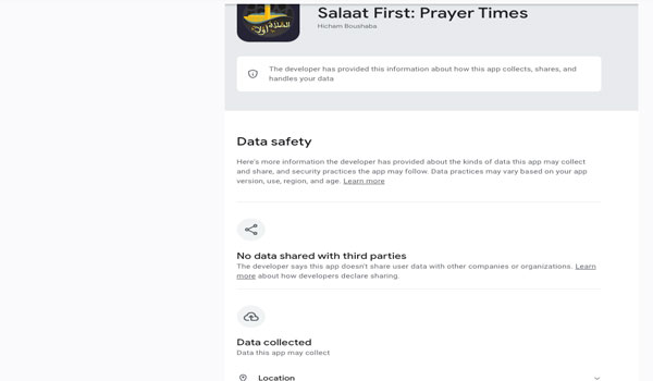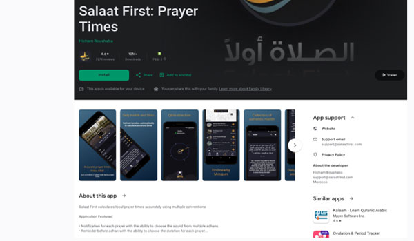 من بين هذه التطبيقات، تطبيق Salaat First: Prayer Times، الذي تجاوزت تنزيلاته على متجر غوغل بلاي وحده 10 ملايين مرة، ولا تُظهر صفحة التطبيق اسم شركة مطوّرة تقف وراءه، بل تذكر اسم المطوّر الفرد فقط، مع الإشارة إلى أن مقره في المغرب.