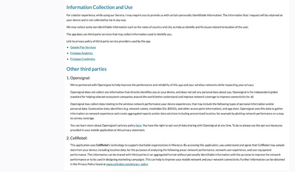 في صفحته على غوغل بلاي، يُفيد المطور بأن التطبيق “لا يشارك البيانات مع أطراف ثالثة”، مع الإقرار بجمع بيانات الموقع الجغرافي ومعرّفات الجهاز وبيانات أداء التطبيق. غير أن سياسة الخصوصية تُشير إلى تفاصيل أخرى.