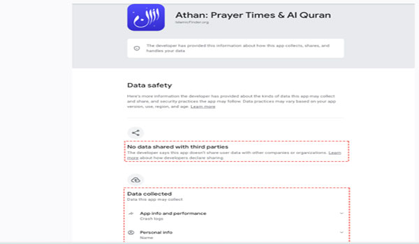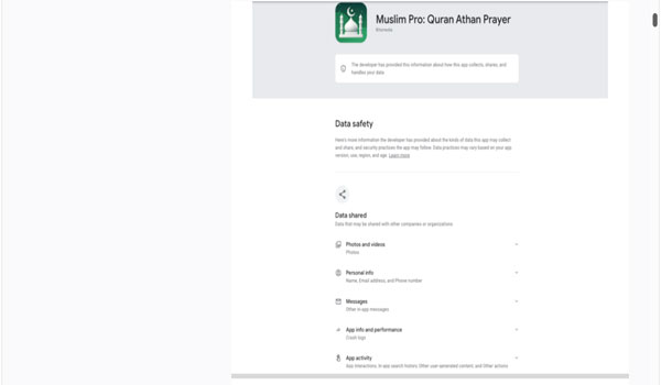 في صفحة التطبيق على متجر غوغل بلاي، يذكر Muslim Pro أنه يجمع ما لا يقل عن 8 أنواع من البيانات، من بينها معلومات شخصية تشمل الاسم والبريد الإلكتروني ورقم الهاتف، وبيانات مالية، ومعرّف الجهاز، إضافة إلى إمكان الوصول إلى الصور.