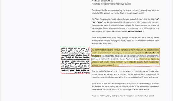 وتضيف السياسة ذاتها: “إذا كنت تعترض على جمعنا لهذه المعلومات الحساسة، فلن تتمكن من استخدام تطبيق مسلم برو، وننصحك بالتوقف عن استخدامه”.