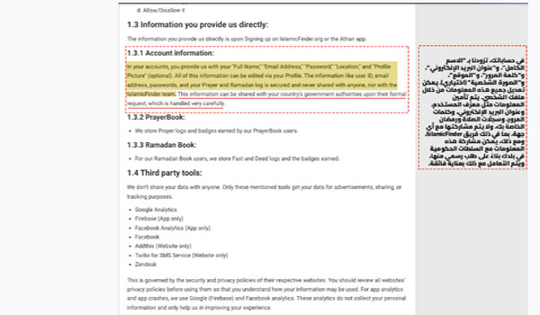 غير أن سياسة الخصوصية المنشورة على موقع Islamic Finder، والسارية على استخدام التطبيق، تتضمن تفاصيل إضافية، فبينما تؤكد في مستهلّها أن البيانات “آمنة ولا تُشارك”، تنص في الوقت ذاته على أنه “قد تتم مشاركة هذه المعلومات مع الجهات الحكومية في بلدك بناءً على طلب رسمي”.