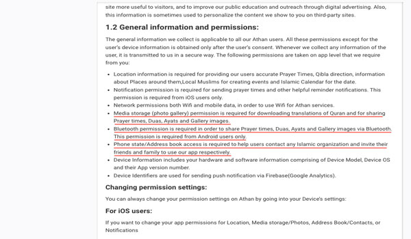 وتتضمن السياسة كذلك تفاصيل عن أذونات لم ترد في صفحة التطبيق على غوغل بلاي، من بينها الوصول إلى معرض الصور، الذي تُبرّره الشركة بأنه “مطلوب لتنزيل ترجمات القرآن ومشاركة مواقيت الصلاة والأدعية والآيات”، كما تشمل هذه الأذونات الوصول إلى جهات الاتصال، مُبرَّراً بـ”مساعدة المستخدمين في التواصل مع المنظمات الإسلامية ودعوة أصدقائهم وعائلاتهم”.