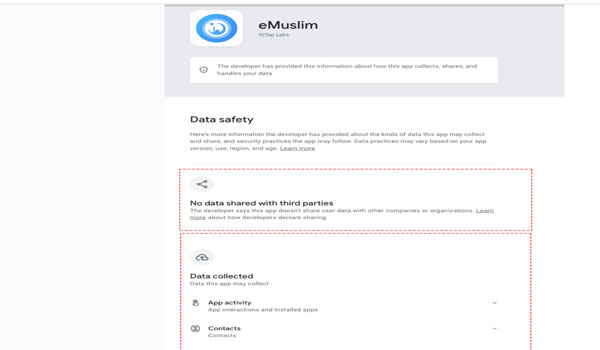 وعلى مستوى الأذونات، يطلب تطبيق e-Muslim الوصول إلى جهات اتصال المستخدم، وهو إذن يثير تساؤلات بشأن مدى الحاجة إليه لوظيفتي مواقيت الصلاة أو قراءة القرآن. وتواصل “عربي بوست” مع الشركة طالباً تعليقاً، ولم يتلقَّ رداً حتى تاريخ النشر.