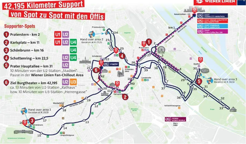 ويمر مسار السباق عبر أشهر معالم العاصمة النمساوية، بدءًا من مركز الأمم المتحدة (UNO City)، مرورًا بحديقة براتر ودار الأوبرا وقصر شونبرون، وصولًا إلى خط النهاية في شارع “رينغ شتراسه” وسط المدينة، ما يجعله واحدًا من أجمل سباقات الماراثون في العالم.