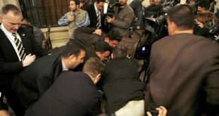 نجا الرئيس الأمريكي جورج بوش من جزمتين كادا ان يرتطما بوجهه خلال مؤتمر صحفي مع نوري المالكي رئيس الوزراء العراقي في بغداد حين ألقى صحفي عراقي بهما على بوش ووصفه بأنه “كلب” باللغة العربية .وقد تفادى الرئيس الأمريكي الجزمه بأعجوبة، وعلق ضاحكًا: “كل ما أستطيع أن أقوله إنهما كانا مقاس 10″، لكن الحراس سارعوا بالإيقاع بالصحفي، ولم ترد تفاصيل عن …