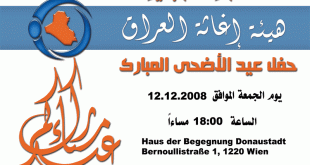تحت هذا العنوان وللمرة الخامسه على التوالي أقامت هيئة إغاثة العراق بالنمسا، يوم الجمعه 12 – 12 – 2008 احتفالها السنوي بعيد الأضحى المبارك بقاعة الاحتفالات الكبرى بالحى الثانى والعشرين بفيينا دعماّ لأطفال وأيتام العراق المهجرين. شارك فى الحفل نحو ألفي شخص من أبناء الجاليه العربية والإسلامية بالنمسا توافدوا من مختلف مقاطعات النمسا برغم برودة الطقس فى مثل تلك الأيام. …