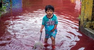 داول العديد من رواد مواقع التواصل الاجتماعي، السبت 6 فبراير/شباط 2021، صوراً وفيديوهات توثق فيضانات بقرية إندونيسية غطتها باللون الأحمر الداكن؛ بعدما اجتاحت مياه نهر بهذه القرية مصنعاً قريباً لأصباغ الباتيك، لتبدو كأن الأمر يتعلق بـ”فيضانات دماء”. إذ نشر آلاف المستخدمين على تويتر صوراً ومقاطع فيديو لقرية جينجوت جنوبي مدينة بيكالونجان في جاوة الوسطى وهي مغمورة بمياه حمراء داكنة، قال بعض المستخدمين …