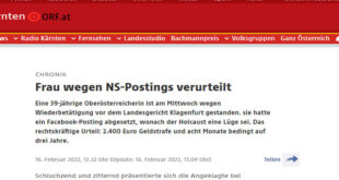 حكمت محكمة نمساوية في مدينة كلاجن فورت يوم الأربعاء الماضى على أمرأة بدفع غرامة مالية قدرها 2400 يورو وسجن مشروطة بثلاث سنوات ، بعد إدانته بإنكار ما يسمى الهلوكوست محرقة اليهود في ألمانيا النازية ، من خلال منشور لها على الفيسبوك تقول فيه إن الهولوكوست كذبة وهي تهمة يعاقب عليها القانون النمساوى ويأتي حكم اليوم تخفيفا ، بعد أن وقفت …
