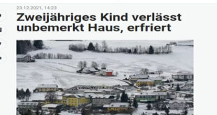 نشرت جريدة هويتة اليومية النمساوية اليوم الخميس ، مأساة قرية ” Mühlviertel” التابعة لولاية بورجن لاند النمساوية ، وفاة طفل يبلغ من العمر سنتين جراء البرد القارس بعد أن غادر المنزل دون أن يلاحظه أحد ، فتجمد حتى الموت أثناء الليل جاء ذلك ليلة الخميس قبل البدء في أختفالات عيد الميلاد بليلة واحدة ، في تجمع سكنى للمنطقة يبلغ ألفين …