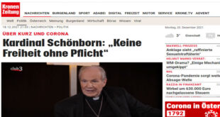 نشر موقع صحيفة كورونا النمساوية اليومية ، أن رئيس أساقفة النمسا الكاردينال كريستوف شونبورن، قال أن التطعيم الإجباري ضد كورونا هو تعدي على الحرية، ولكن الحرية أيضاً لها حدود عندما يتعلق الأمر بالعمل الخيري ، أظهر شونبورن، تفهمه للتطعيم الإلزامي الذي تخطط له الحكومة، وقال في البرنامج التلفزيونى “Club 3” الذي بثته الصحيفة ، بالطبع، حتى لو كان المقصود أن …
