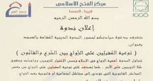 تنظم أدارة مسجد الفتح بالحى الخامس عشر ندوة بعنوان ” توعية المقبلين على الزواج بين الشرع والقانون” ، ذلك يوم السبت القادم 30 من أكتوبر في تمام الساعة السابعة والنصف بعد صلاة العشاء مباشراّ تهدف الندوة إلى أهمية الزواج في الإسلام وحسن الأختيار وحقوق كلا الزوجين على الأخر، لبناء شراكة تقوم على الحب والاحترام والمسؤولية والتوعية بالشروط الواجب توافرها لبدء …