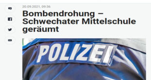 نشرت صحيفة هويتة اليومية النمساوية اليوم الأثنين إن السلطات أخلت مدرسة في مدينة شفخات Schwechat “، القريبة من مطار فيينا الدولى ، في أعقاب إنذار بوجود قنبلة ، وتقوم قوات الطوارئ حاليًا بتفتيش مبنى المدرسة. وأضافت الصحيفة ، أن شخص مجهول أبلغ إدارة المدرسة المتوسطة الجديدة في Europaplatz في Schwechat بوجود قنبلة بالمدرسة، مما اضطر المدرسون والطلاب إلى مغادرة المبنى …
