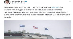 أعلن المستشار النمساوي سيباستيان كورتز، اليوم الجمعة الموافق 14 من مايو 2021، رفع العلم الإسرائيلي فوق مقر مبنى المستشارية النمساوية في قلب العاصمة فيينا ، تضامنا مع إسرائيل . وكتب كورتز على تويتر: “رفع العلم الإسرائيلي اليوم فوق مبنى مكتب المستشار الفيدرالي تضامنا مع إسرائيل”. وأضاف أن “الهجمات الإرهابية على إسرائيل تستحق أشد الإدانة ونحن إلى جانب إسرائيل”، حسب تعبيره. …