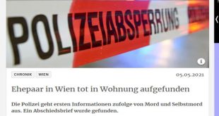 في واقعة مأساوية شهدها الحى السادس عشر – فيينا ، عثرت الشرطة النمساوية اليوم الأربعاء في الصباح الباكر على جثة زوجين مسنين في منزلهما بالعاصمة فيينا إثر انتحارهما بعد معاناتهما الكبيرة مع مرض يقال أنه حسب ما ورد في الصحف المحلية ووفقًا لتقرير نشرته صحيفة «الكورير» اليومية النمساوية ، الرجل كان يعاني من مرض خطير وأمتنع عن أخذ العلاج المُعتاد …