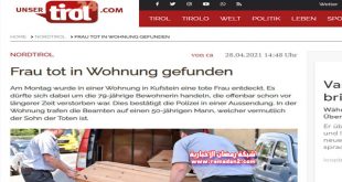 عثر رجال الشرطة في ولاية التيرول النمساوية التي تقع في أقصى غرب البلاد يوم الأثنين الماضى على جثة أمرأة تبلغ من العمر 79 غاماّ من عمرها داخل شقتها في مدينة كوفشتاين ، وتم نقل الجثة إلى المستشفى وقد تبين للشرطة أن الوفاة طبيعية ومنذ فترة طويلة ، لكن سبب الوفاة ما زالت مجهولة وغير واضح بالنسبة للمحققين ، ولا توجد …