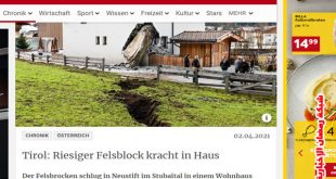 تعرض منزل مكون من طابقين لخسائر فادحة نتيجة لسقوط صخرة ضخمة إنحرفت من إحدى التلال المحيطة بقرية ” Neustift ” في منطقة ” Stubaital” التابعة لولاية التيرول التي تقع في أقضى غرب النمسا ، المنزل الواقع في إحدى المنعطفات الجبلية لحقت به خسائر كبيرة ، فيما تم إخلال المنزل بالكامل، فكانت النتيجة كما بالصور المرفقة خسائر مادية كفيرة سقطت صخرة …
