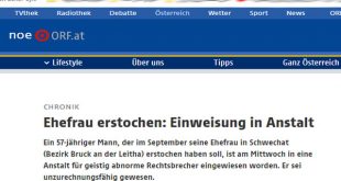 أقدم شخص نمساوى في شهر سبتمبر من العام الماضى 2020 ، والذى يبلغ من العمر 57 سنة على ذبح زوجته من 55 سنة ، داخل مقر سكنهما الواقع في مدينة شفخات القريبة من مطار فيينا التابعة لولاية النمسا السفلى وحسبما نشرت الصحف النمساوية اليوم أن المتهم مريض بالأنفصام في الشخصية ويعانى بجنون العظمة منذ ما يقرب من عقدين من الزمن، …