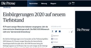 انخفض عدد الحاصلين على الجنسية النمساوية خلال العام الماضى 2020 بنسبة 15,2 بالمئة مقارنة بـ عام 2019 ، وأفاد بيان هيئة الاحصاء النمساوية اليوم الجمعة أن عدد حالات منح الجنسية النمساوية للاجانب ” التجنيس ” بلغت فى عام 2020 ، أدنى مستوى على الإطلاق مقارنة بالعام السابق 2019 للذين حصلوا على الجنسية 8996 شخصاً . وأضاف البيان أنه تم تسجيل …