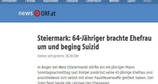 أقدم نمساوى اليوم الأثنين ظهراّ الموافق 18 من يناير 2021 ،على قتل زوجته البالغة من العمر 61 عاماّ بطلق نارى من مسدسة المرخص عيار تسعة ملليمترات ، ثم أقدم على الانتحار بإطلاق النار على نفسة وذكرت الأخبار الواردة من مدينة فايتز “Weiz” التابعة لولاية إشتاير مارك التي تبعد عن العاصمة فيينا حوالى 400 كيلو غرباّ ، أن الرجل البالغ من …