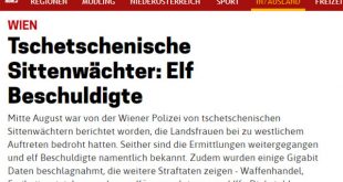 تواصل أجهزة الامن النمساوية التحقيق فى قضية التجمع الذي يتكون من 11 شيشانيًا – بينهم امرأة واحدة – أطلقوا على انفسهم اسم ” حراس الاخلاق ” وقاموا بارهاب العديد من النساء الشيشانيات بعد اتهامهن بأنهن أصبحن غربيات ويسلكن كما تسلك الاوروبيات . ويوجد حاليا أربعة من المتهمين رهن الاعتقال بينما هرب سبعة آخرين وتتوقع الشرطة ارتفاع عدد الجناة والضحايا فى …