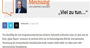 طالب الكاتب النمساوي البارز، منفرد ماورر، الحكومة، الأربعاء، باتخاذ خطوات قوية لمواجهة الإخوان في البلاد، غداة نشر تحقيق عن دعم قطر للتنظيم بهدف زعزعة استقرار فيينا والدول الأوروبية. وفي مقال نشرته وكالة الأنباء النمساوية الحكومية وصحيفة فولكس بلات النمساوية (خاصة)، قال ماورر: “تأخرت الحكومة في إنشاء مركز توثيق الإسلام السياسي، لكن صحفا وكتبا استطاعت رسم صورة كاملة لمدى خطورة شبكة …