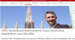 نشر موقع جريدة الكوريير النمساوية اليومية واسعة الأنتشار اليوم الخميس الموافق 27 من أعسطس 2020 ، أن عضواً سابقآ في حزب الحرية اليميني المتشدد “FPÖ” المعروف بعداءه للمهاجرين عامة و المسلمين خاصاّ ، أن العضو قد اعتنق الإسلام ، وقام بتغيير أسمة من “ألفريد وندراتش” ‘إلى “على” ، وقدم أستقالتة من جميع مناصبة السياسية والوظيفية في حزب الحرية النمساوى المتشدد …