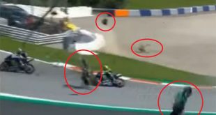 شهد سباق جائزة النمسا الكبرى للدراجات النارية “موتو جي بي”، الذي أقيم أمس الأحد، حادثا مروعا، بعد اصطدام بين الدراجين فرانكو مربيديلي ويوهان زاركو. وتطايرت دراجتا مربيديلي وزاركو في الهواء بعد الاصطدام على أقصى ارتفاع وبسرعة عالية جدا، مما جعل المتسابقين الآخرين أكثر عرضة للخطر. واصطدمت دراجة دوكاتي الخاصة بزاركو بالحاجز الجانبي عند المنعطف الثالث، قبل أن ترتد إلى الحلبة، بينما …