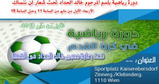 ينظم محبى الراحل خالد الحداد فى النمسا دورة رياضية لكرة القدم تحت شعار ” لن ننساك ” ، تخليداّ لروح فقيد ذلك يوم الأربعاء الموافق الأول من مايو 2019 ، تبدأ الدورة من الساعة الحادية عشر صباحاّ وتمتد حتى الساعة السادسة مساءّ وجأت هذه الدورة بمبادرة من بعض الاتحادات والنوادى المصرية فى فيينا ، ومجموعة من محبى وزملاء الفقيد وعدد …