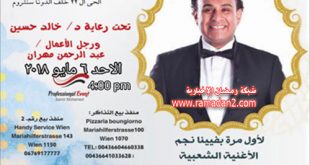 يحيي المطرب الشعبى محمود الليثى حفلاً كبيرا للجاليه المصرية والعربيه لاول مره في العاصمه النمساويه ” فيينا ، يوم الأحد الموافق 6 من مايو المقبل ، بمقر قاعة الأحتفالات الكبر بالحى الثانى والعشرين خلف المركز التجارى المعروف بأسم الدوناو سنتروم ” Donauzentrum”، يبدأ الحفل فى تمام الساعة الرابعة عصرأ . و من المقرر أن يقام الحفل تحت رعاية رئيس …
