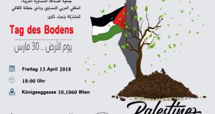يُحيي أبناء الشعب العربي الفلسطيني فى النمسا الذكرى 42 ليوم الأرض ، وذلك يوم الجمعة القادمة الموافق 13 من أبريل بقاعة الأحتفالات الكبرى بالحى السادس – فيينا فى تمام الساعة السادسة مساءّ على العنوان التالى : – Königseggasse 10 ; Wien 1060 والدعوة للجميع عامة تعتبر ذكرى “يوم الأرض الفلسطيني” رمزًا للتشبث بالأرض والهوية والوطن، وعنوانًا لرفض كل سياسات …