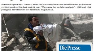 نشرت جريدة “الدي بريسه” انمساوية على موقعها الألكترونى تقرير عبارة عن مجموعة من الشهادات من الأطباء و جمعيات الإغاثة في “الغوطة الشرقية” السورية، والتي اختصرها أحد الأطباء في قوله “هنا الجحيم بعينه”. ووصف الموقع، الهجوم على الغوطة بأنه “يعد واحدًا من أكثر الغارات دموية منذ بداية الصراع في سوريا؛ إذ قتل 231 شخصًا وأصيب ألف و200 آخرون خلال 48 …