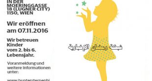 أعلان مكرر بناءّ على رغبة صاحب الإعلان ، حيث أن الأفتتاح تم فى شهر نوفمبر الماضى تم افتتاح حضانة السماء ذات النجوم الملونة ” Bunter Sternenhimmel” فى الحى الخامس عشر – فيينا بشارع ” Moeringgasse 18″ بالقرب من المركز التجارى المعروف لوجنر سيتى ، كما تستقبل الحضانة من عمر سنتين وحت 6 سنوات ، وتهتم الحضانة بـ أولياء الأمور …