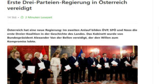 تناولت الصحف العالمية تشكيل الحكومة النمساوية الجديدة بين حزب الشعب النمساوي (ÖVP)، الحزب الاشتراكي الديمقراطي (SPÖ) وحزب نيوس (NEOS) بتفسيرات متباينة، حيث أغلبها أن التحالف الجديد يعكس ضرورة التوصل إلى تسويات سياسية لتجنب صعود اليمين المتطرف. بدءاً بصحيفة “Süddeutsche Zeitung” الألمانية التي رأت أن الاتفاق الحكومي “عمل فني انتقائي”، يجمع بين سياسات الهجرة المحافظة، والأولويات الاشتراكية الديمقراطية مثل فرض ضريبة …