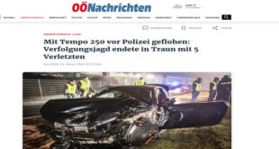حاول شاب (20 عاماً) فى مدينة فيلس بولاية النمساوية التابعة لمقاطعة النمسا العليا تجنب نقطة تفتيش للشرطة في النمسا، وقاد سيارة بسرعة وصلت إلى 250 كيلومتراً في الساعة في بعض الأحيان، مما أسفر عن إصابة خمسة أشخاص بينهم شرطيان اثنان. وأفادت الشرطة بأن الرجل تجاهل الإشارات الحمراء وسلك الجانب المخصص للسيارات المعطلة، أثناء المطاردة التي بدأت في ساعة متأخرة أمس …