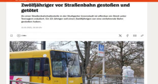 مأساة هزت مدينة شتوتغارت جنوب غربي ألمانيا، اليوم الجمعة. فقد لقي طفل عمره 12 عاماً حتفه تحت عجلات ترام، بعد أن دفعه آخر يبلغ 13 عاما على السكة الحديدية، وذلك عقب مشادة بينهما، وفق تقارير. ووقع الحادث في محطة ترام قرب بحيرة “ماكس آيث” في شمال شتوتغارت منتصف يوم الجمعة. فيما أعلن مكتب المدعي العام أنه تم تسليم الجاني المشتبه …