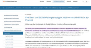 تحرص الدولة النمساوية على تعزيز جهود الحماية الاجتماعية وتحقيق الأمن الأجتماعى ، فقد أعلنت الحكومة النمساوية على زيادة بنسبة 4.6% في قيمة دعم الأسر (Familienbeihilfe)، وهي مساعدة مالية شهرية تقدمها الدولة لدعم الأطفال حتى 18 سنة، وهذه الزيادة ستدخل حيز التنفيذ اعتباراً من 1 يناير 2025، وتعد هذه الخطوة جزءًا من الجهود المستمرة للحكومة النمساوية لتخفيف العبء المالي عن العائلات …