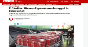 تمكنت جمارك مطار العاصمة النمساوية فيينا من ضبط محاولة تاريخية فى تهريب عدد من السجائر تقدر بحوالي 170.000 سيجارة، وحوالي 50 كيلوغرامًا من تبغ الشيشة، وأكثر من 6.000 حبة من المنشطات الجنسية، داخل 11 حقيبة تم تفتيشها من قبل موظفي الجمارك وهذا يعتبر مخالفة للائحته التنفيذية وقانون الاستيراد والتصدير وغيرها من القوانين واللوائح المنظمة لذلك. ففي أثناء إنهاء إجراءات الركاب …