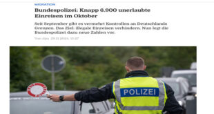 قالت الشرطة الاتحادية الألمانية إن شرطة الحدود اكتشفت 6889 محاولة دخول بدون تصريح خلال شهر أكتوبر . وأوضحت الشرطة الاتحادية أن هذا الرقم مشابه للغاية لرقم الأشخاص الذين تم توقيفهم المسجل في شهر سبتمر، وخلال الفترة من مارس وحتى أغسطس، كان الرقم يتراوح بين 7 آلاف و7800 كل شهر، وفي يناير كان الرقم المسجل هو 6906، مقابل 5998 في فبراير. ولم …