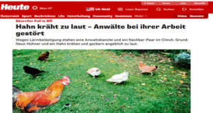 يمثل مالكا الديك النمساوى ،من بلدة Perchtoldsdorf بمنطقة Mödling بالنمسا السفلى، أمام المحكمة بعد شكوى أحد الجيران من مكتب محاماة مجاور انزعاجه من صياح الديك المتكرر على مدار اليوم بصوت عالٍ، حيث كانت الدعوى تتضمن صعوبة التركيز، وإرهاق السمع مع ضرورة الكف عن تربيته وهى الأعراض التى ذكرها المدعى الذى استدعى مالكى الديك للمثول أمام المحكمة والمعروف أن سكان المدن …