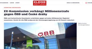 خلصت المفوضية الأوروبية بعد إجراء تحقيق أولي عن فرض غرامة مالية ضخمة بقيمة إجمالية تبلغ 48.7 مليون يورو ، حيث أن شركة السكك الحديدية الحكومية التشيكية “سي.دي” تواطأت مع نظيرتها النمساوية “أو.بي.بي” لإحباط المنافسة في قطاع السكك الحديدية للركاب. وأضافت المفوضية أن الشركتين نسقتا تحركاتهما بين في الفترة ما بين عامي 2012 و2016، لمنع شركة السكك الحديدية التشيكية الناشئة “RegioJet” …