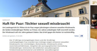 قضت محكمة مجلية في مدينة النمساوية بالجكم على زوجين الزوج 13 سنة والزوجة 3 سنوات , بسبب اعتداءهما الجنسي على ابنتيهما القاصرتين على مدى سنوات طويلة وقد استمر هذا الاعتداء لمدة أربع سنوات، والحكم ضد الأم أصبح نافذًا. وبحسب ما نشر في الصحف النمساوية ، حيث تعود القضية إلى الفترة من عام 2019 حتى نهاية يناير 2024، حيث قام الزوجان …