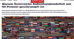 انخفض حجم العجز التجاري في النمسا بشكل حاد بلغ 90% إلى 2.02 مليار يورو فقط في العام الماضي 2023 مقارنة على أساس سنوي. وأظهرت أحدث أرقام رسمية صادرة عن هيئة الإحصاء النمساوية، انخفاض العجز في تجارة النمسا الخارجية بشكل كبير في عام 2023، من 20.59 مليار يورو في عام 2022 إلى 2.02 مليار يورو فقط في العام الماضي. وأرجع توبياس …