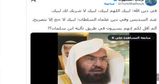 أثارت تصريحات لرئيس الشؤون الدينية في الحرمين الشريفين الشيخ عبد الرحمن السديس، جدلاً واسعاً على منصات التواصل الاجتماعي بخصوص تلبية الحج وربط دعوة “لبيك اللهم لبيك، لبيك لا شريك لك لبيك” بتصريح الحج. واعتاد إمام الحرم المكي السابق الشيخ عبد الرحمن السديس على تصريحات ومواقف تصب دوما في خدمة السلطة وإطاعة ولي الأمر، وتسعى لصبغ شرعية دينية على خياراتها السياسية-وفق …