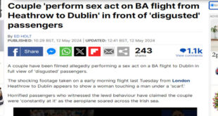 صوّر مسافرون زوجين وهما يمارسان الجنس على متن طائرة تابعة لشركة الخطوط الجوية البريطانية، متجهة إلى دبلن عاصمة أيرلندا، على مرأى ومسمع من الركاب “المشمئزين”. ووفق صحيفة “ديلي ميل” البريطانية، فإنّ اللقطات تم تصويرها على متن رحلة في الصباح الباكر يوم الثلاثاء الماضي من مطار هيثرو في لندن إلى دبلن. وزعم الركاب الذين شهدوا السلوك البذيء أن الزوجين كانا “يراقبان …