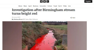 أطلق مجلس مدينة برمنغهام البريطانية تحقيقاً في حادثة غريبة تكشفت في مجرى نهر برمنغهام، رصدها أحد المارة يوم 25 يناير/كانون الثاني، حيث تلوّن النهر بأكمله باللون الأحمر القاتم وهو ما اعتبره البعض ظاهرة مرعبة كما وصفته صحيفة “ديلي ميل” بأنه علامة من علامات اقتراب موعد يوم القيامة. برمنغهام : حادثة نهاية العالم بعد إعلام السلطات البريطانية من قبل أحد المواطنين …