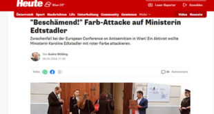 تعرضت الوزيرة الاتحادية للشؤون الأوروبية كارولين إدشتادلر، لهجوم “بطلاء أحمر” أثناء مشاركتها في مؤتمر لمكافحة معاداة السامية، اليوم الإثنين، في أكاديمية العلوم في فيينا. وبحسب تقارير إعلامية، حاول أحد الناشطين ينتمي إلى مجموعة “ليس باسمي” رش الوزيرة بطلاء أحمر، قبل أن يتمكن ضباط الأمن من منعه. وقالت المتحدثة باسم الوزيرة إن الرجل كان ينتظر بجوار الباب ومعه دلو طلاء كبير، …