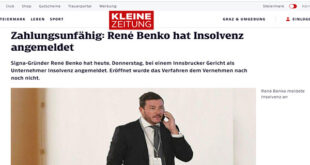 تقدم المستثمر النمساوي رينيه بينكو، مؤسس مجموعة سيجنا للعقارات وتجارة التجزئة، بطلب إشهار إفلاسه، حسبما أكدت متحدثة باسم محكمة إنسبروك لوكالة الأنباء النمساوية (APA). وقالت المتحدثة، إن القاضي من المتوقع أن يبت في الطلب الذي قدمه المستثمر في الأيام المقبلة. وأكدت أن التقارير التي تفيد بأن بينكو تقدم بطلب بما يسمى إفلاس خاص غير صحيحة. وكانت هيئة التمثيل القانوني لجمهورية …
