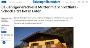 أنهى شاب نمساوى حياة والدته رمياّ بالرصاص يوم أمس الخميس الموافق 23 من نوفمبر 2023 ، بواسطة بندقية صيد ثم قام بإبلاغ الشرطة وتسليم نفسه بعدما توارى عن الأنظار لمدة محدودة في ولاية سالزبورج النمساوية التي تقع في غرب البلاد. وحسبما نشرت الصحف النمساوية اليوم ، أن القاتل البالغ من العمر 31 عاما ، قام بالاتصال بالشرطة وأبلغهم بأنه إطلاق …