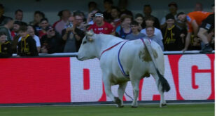 اقتحم ثور ضخم ملعب مباراة للرغبي في الدوري الفرنسي، وطارد لاعبي أحد الفريقين فيما ترك آخرين، في موقف يجمع بين الرعب والطرافة. فيديو لثور هائج يقتحم ملعباً وخلال فترة الإحماء للمباراة التي جمعت فريقي كاتالان دراغونس وسانت هيلنز، على ملعب غيلبرت بروتوس في بربينيان، تفاجأ اللاعبون بأحد الثيران الضخمة يقتحم ملعب المباراة. وسارع لاعبو كتالان دراغونز إلى رمي الكرات والفرار، …