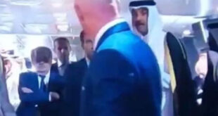 تداول رواد مواقع التواصل الاجتماعي، فيديو يوثق رفض أمير قطر الشيخ تميم بن حمد آل ثاني، طلب رئيس الاتحاد الدولي لكرة القدم (فيفا)، أن يتقدم الرئيس الفرنسي إلى الأمام أثناء توجههم لمنصة التتويج. وأظهر الفيديو إشارة رئيس الفيفا للرئيس الفرنسي بأن يتقدم أمام أمير قطر، إلا أن الشيخ تميم رفض ذلك وأشار بالسير، وهو ما أدى إلى امتعاض رئيس الفيفا. …